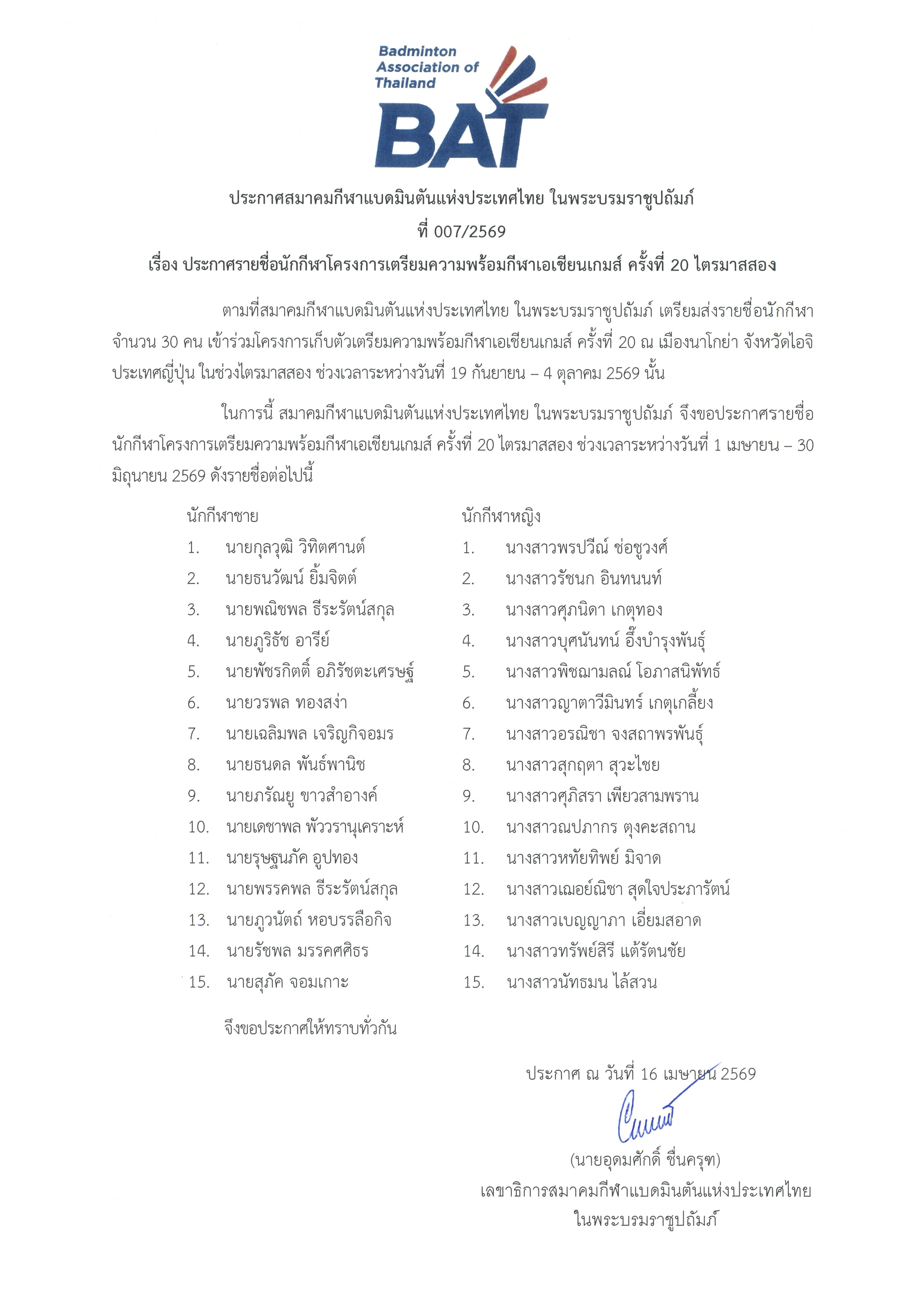 ประกาศรายชื่อนักกีฬาแบดมินตันทีมชาติไทย รายการ BWF Thomas & Uber Cup Finals 2026