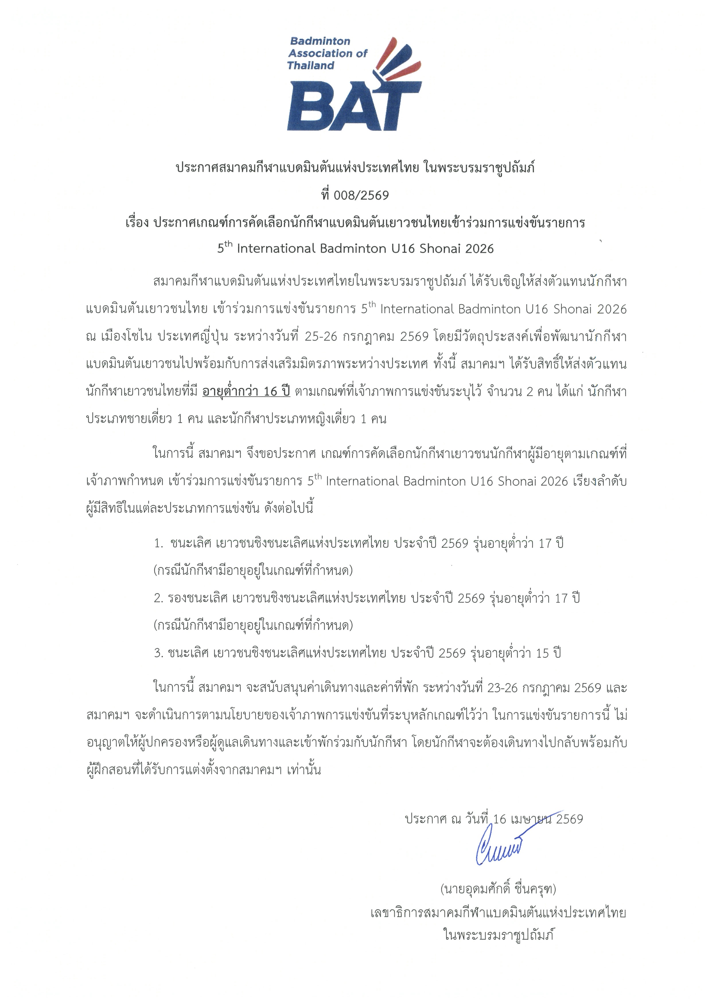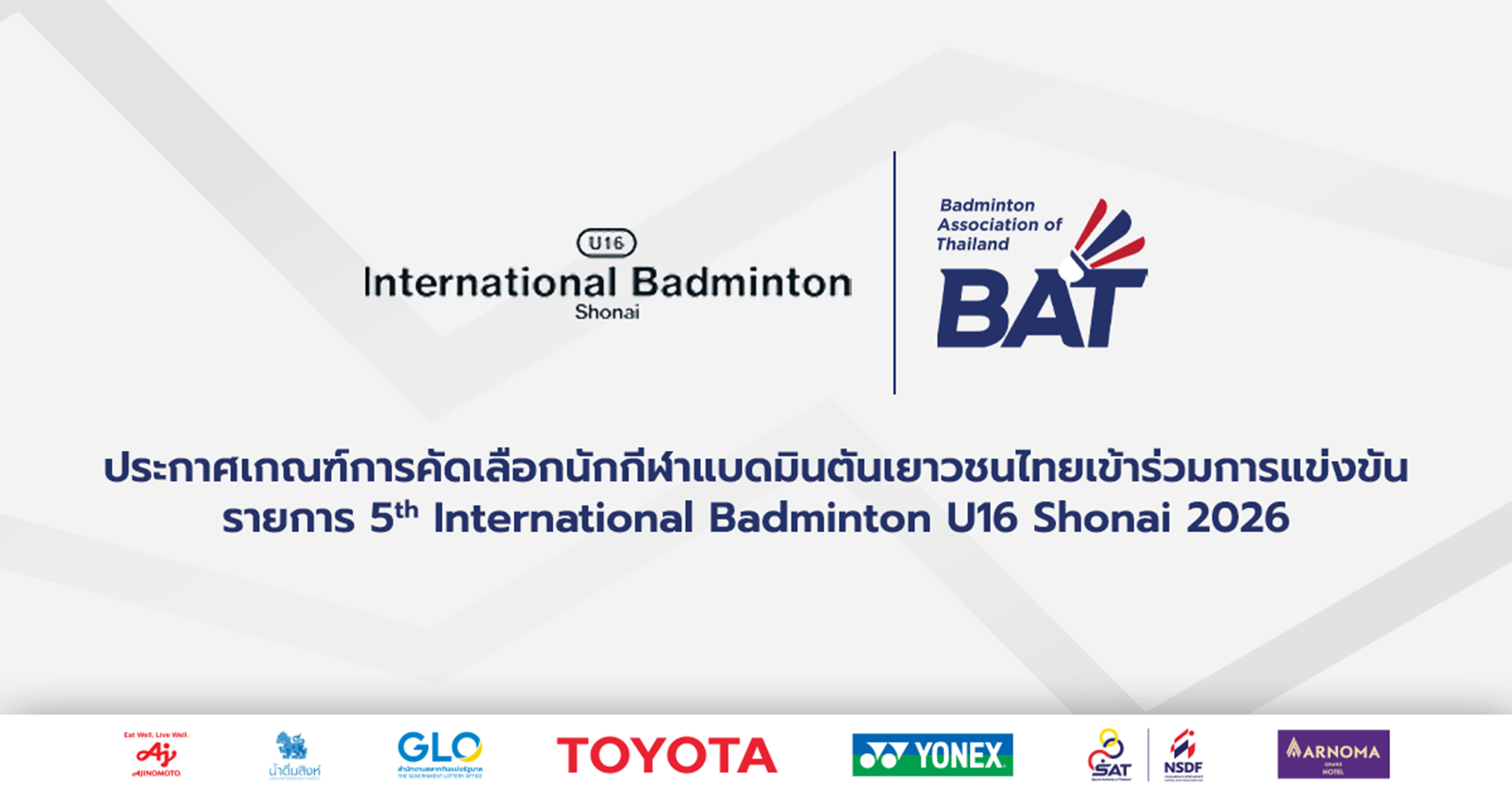 เกณฑ์การคัดเลือกนักกีฬาแบดมินตันเยาวชนไทยเข้าร่วมการแข่งขัน รายการ 5th International Badminton U16 Shonai 2026