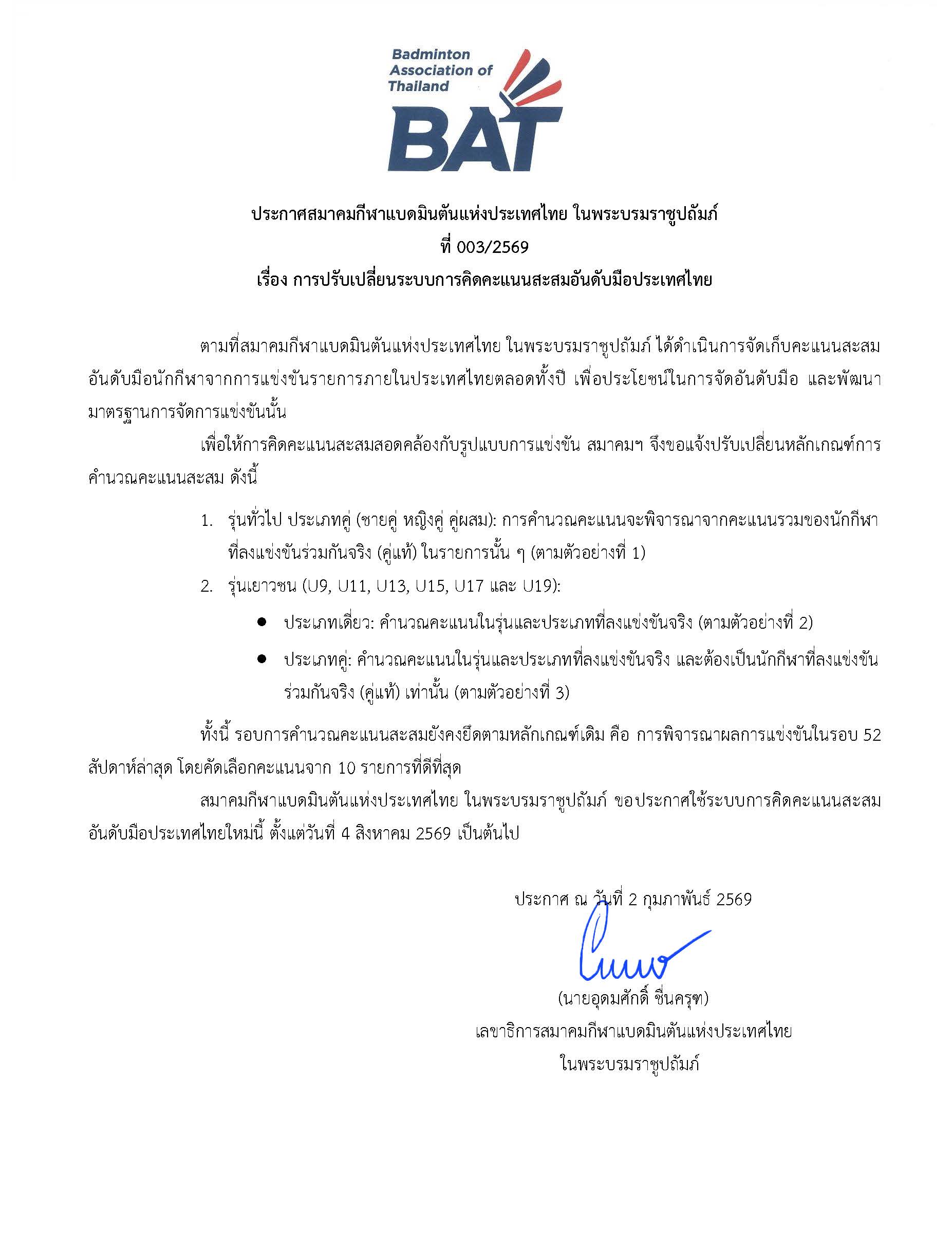 ประกาศ - เรื่อง.. การปรับเปลี่ยนระบบการคิดคะแนนสะสมอันดับมือประเทศไทย