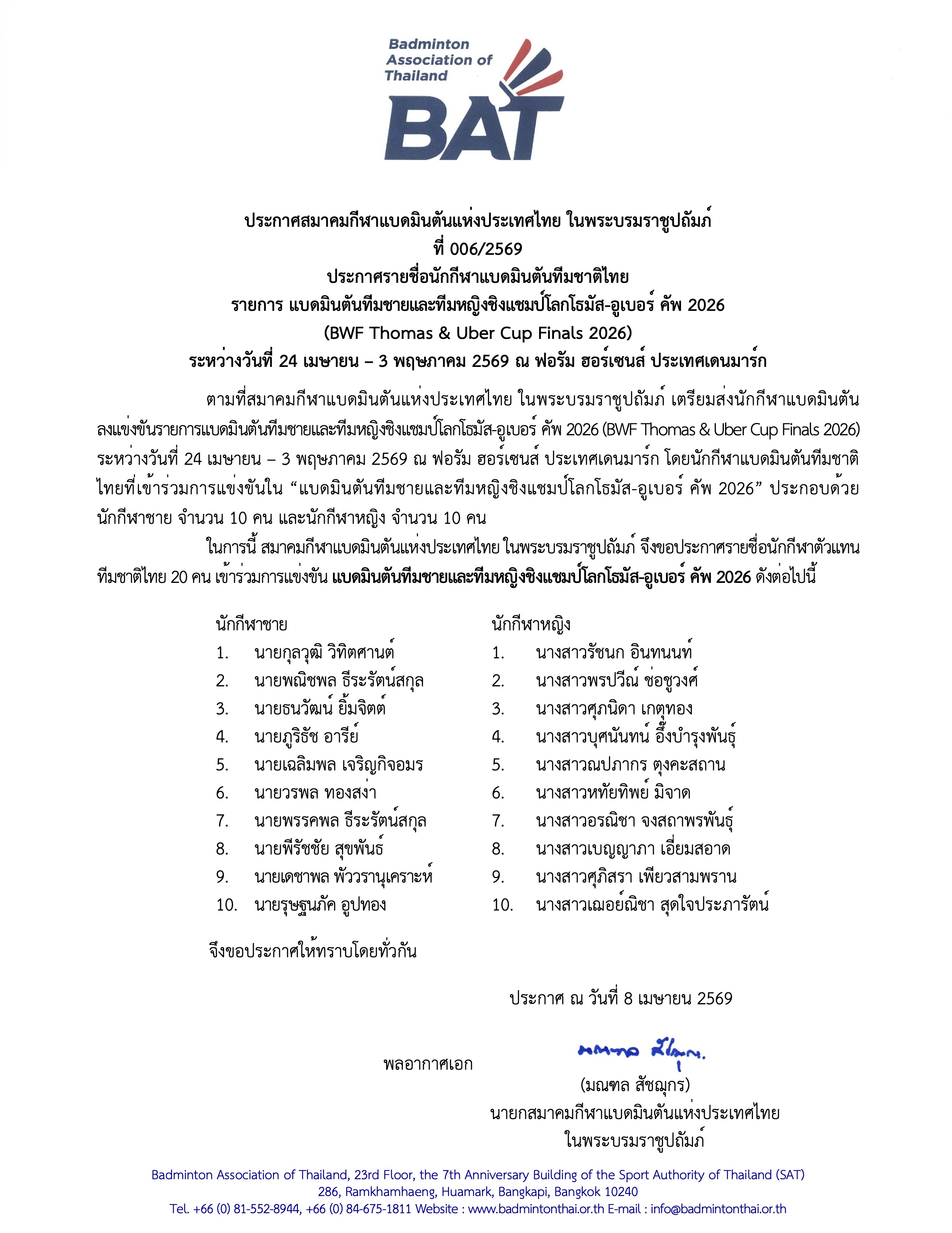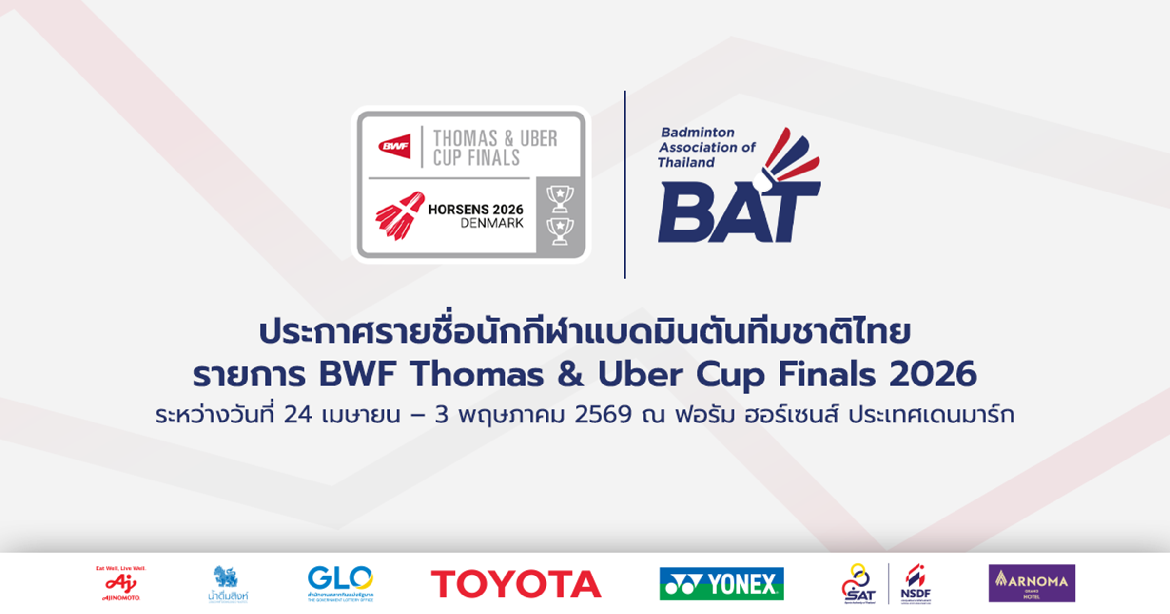 ประกาศรายชื่อนักกีฬาแบดมินตันทีมชาติไทย รายการ BWF Thomas & Uber Cup Finals 2026