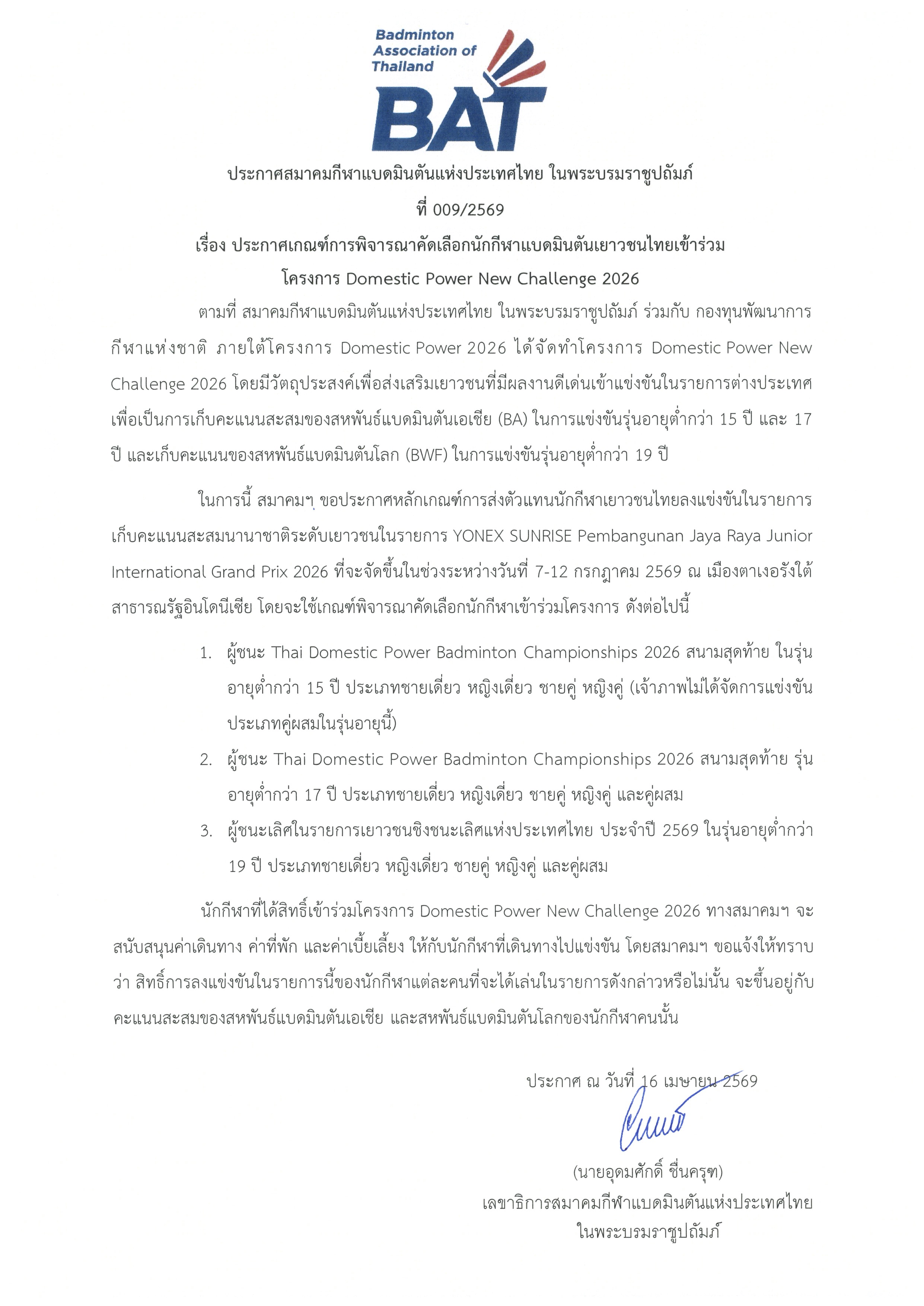 ประกาศเกณฑ์การคัดเลือกนักกีฬาแบดมินตันเยาวชนไทย เข้าร่วมโครงการ Domestic Power New Challenge 2026